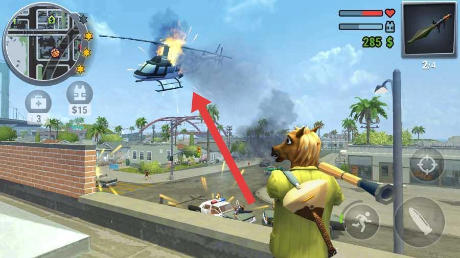 在屋顶展开激战,操控马头造型的角色,点击箭头所指的直升机,利用火箭筒发起攻击,摧毁空中的目标,完成这场高难度的挑战。