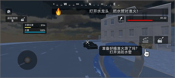 进入游戏后,右侧的箭头负责控制前进与后退,右边的箭头还能调节车的方向,右侧上方的图标依次为车辆报警器和消防水管切换按钮。