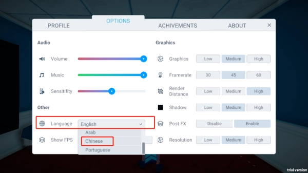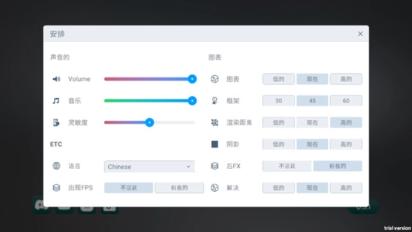 2、进入游戏之前,我们可以进行声音、音乐、灵敏度、图表、框架、渲染、阴影等选项的设置,