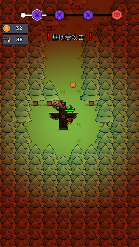 在森林场景里,控制角色和怪物展开战斗,收集金币之类的资源,还要关注篝火0/20这类任务,保障基地的安全。