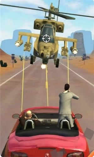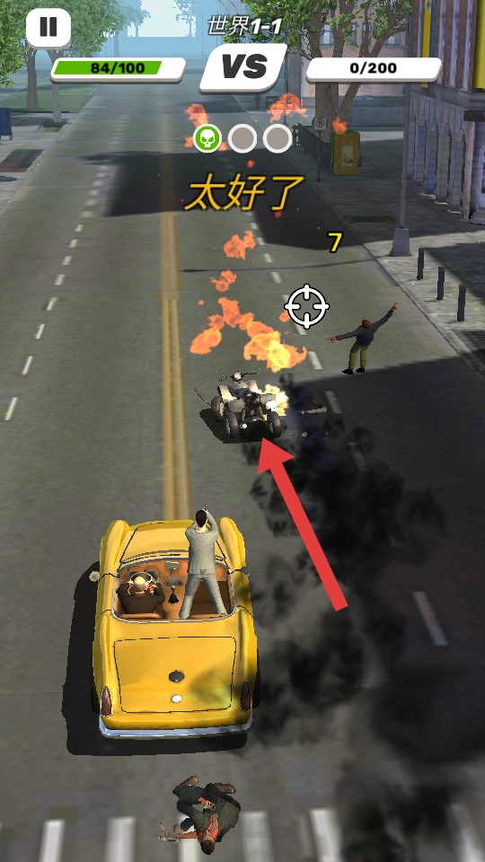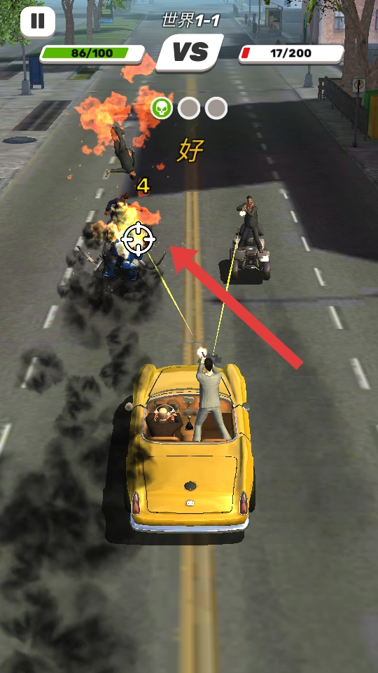 进入关卡后,要马上熟悉黄色汽车的射击操作,对准前方城市道路上骑摩托的敌人,别因为车辆移动而错失瞄准的机会。