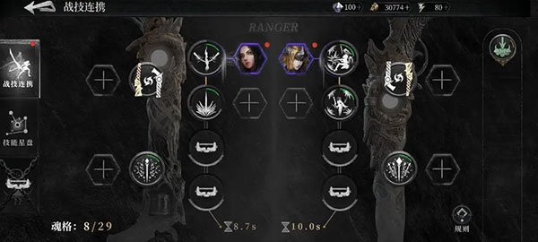 接下来按照指引把破盾者魂核和技能进行关联,这样就能获得属性加成以及特色魂技。魂技包含主动和被动两类,主动魂技只有紫色及以上的非素材魂核才具备,当角色释放和该魂核相关联的技能时,主动魂技会一同释放。需要留意的是,每个主动魂技都有独立的冷却时间,在实际战斗里,要是非冷却状态的技能和带有主动魂技的魂核相关联,其图标下方会出现小点提示——绿点代表魂技已经准备好,橙色小点则意味着魂技还在冷却中,此时使用关联技能不会触发对应的魂技。