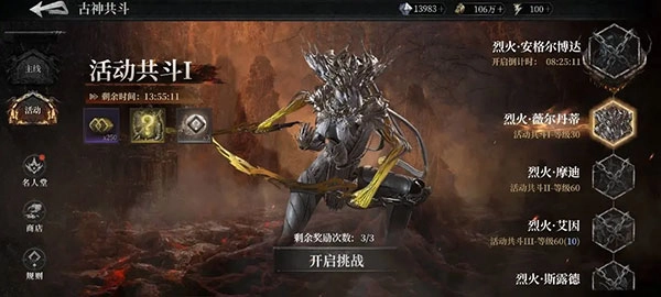 古神共斗是3人或5人组队联机挑战强力BOSS的玩法,主要分为主线共斗、旅团共斗和活动共斗三类。其中活动共斗的BOSS会随版本更新而变化,并且带有不同的元素属性,通常需要借助元素克制的关系来进行针对性应对。比如开服版本的BOSS都是火系的,那么玩家就可以使用带有冰伤词条的武器和冰伤魂核来攻击它们。活动共斗是多人玩法的核心部分,会掉落强力的武器装备和符文,建议每天都把奖励次数打完。活动共斗有一定的难度,可以拉上实力相近的小伙伴一起挑战,也可以在社区中多交流讨论打法技巧。