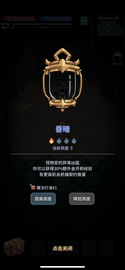 低亮度模式:在战力远超对手的情况下适用,开启后能提高掉落物品的品质,不过对应的怪物难度也会随之增加。