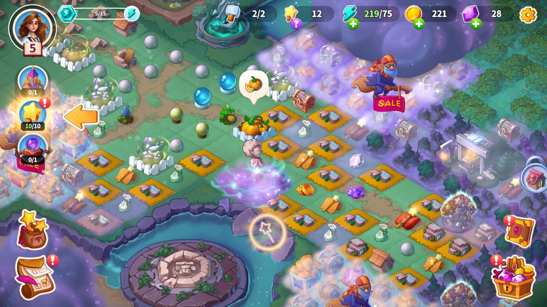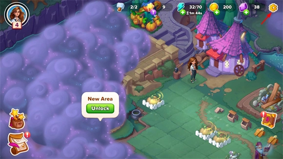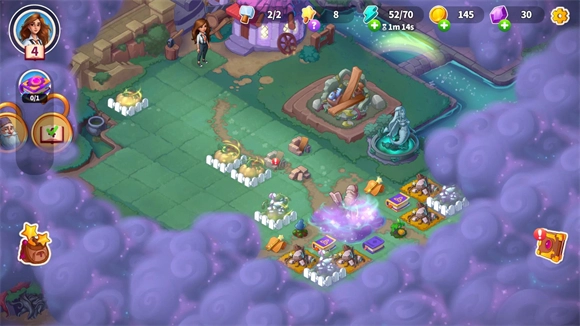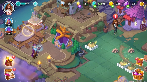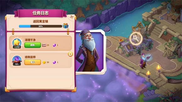 点击屏幕左侧的按钮就能查看当前任务,消耗一定数量的魔法棒即可完成任务并修复建筑。