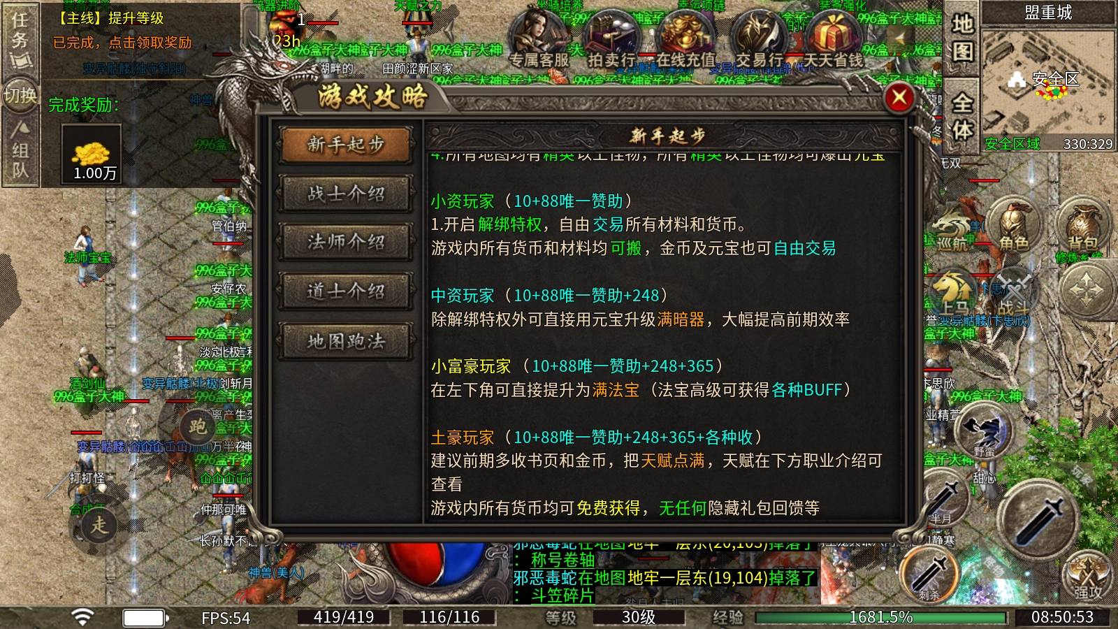 游戏开服活动一定要参与,能获取经验、金币、元宝以及前期的高级装备。