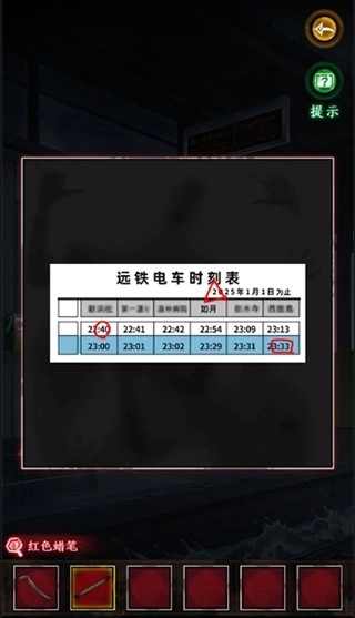 玩家们等待电车抵达后,发现电车的大门处于锁闭状态,于是退回候车厅,找到电车时刻表,通过数字与图案的形状,推导出了锁的密码。