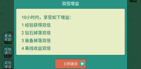 双倍增益确实很划算,开四个双倍的话,激活之后经验、钻石还有装备掉落都特别快,而且一次能持续10小时呢!