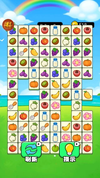 只需点击屏幕上两个相同的水果方块,它们就会消失,不过得确保中间没有其他方块阻挡。