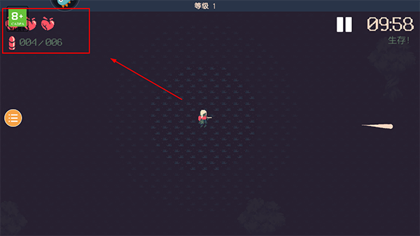 右上方会显示子弹状态和角色的血量,保持警惕以维持生存。