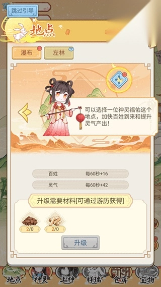 地方升级后,可选择神灵来庇佑此地,这样能加快百姓迁入的速度,同时提升灵气的产出量。
