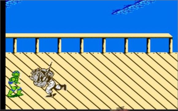 通关小技巧:BOSS的攻击伤害相当高,当它发起冲撞时,切记不要用飞踢技能;之后随便用哪个忍者龟的技能去攻击BOSS就行,不过通常还是得消耗一条生命值。