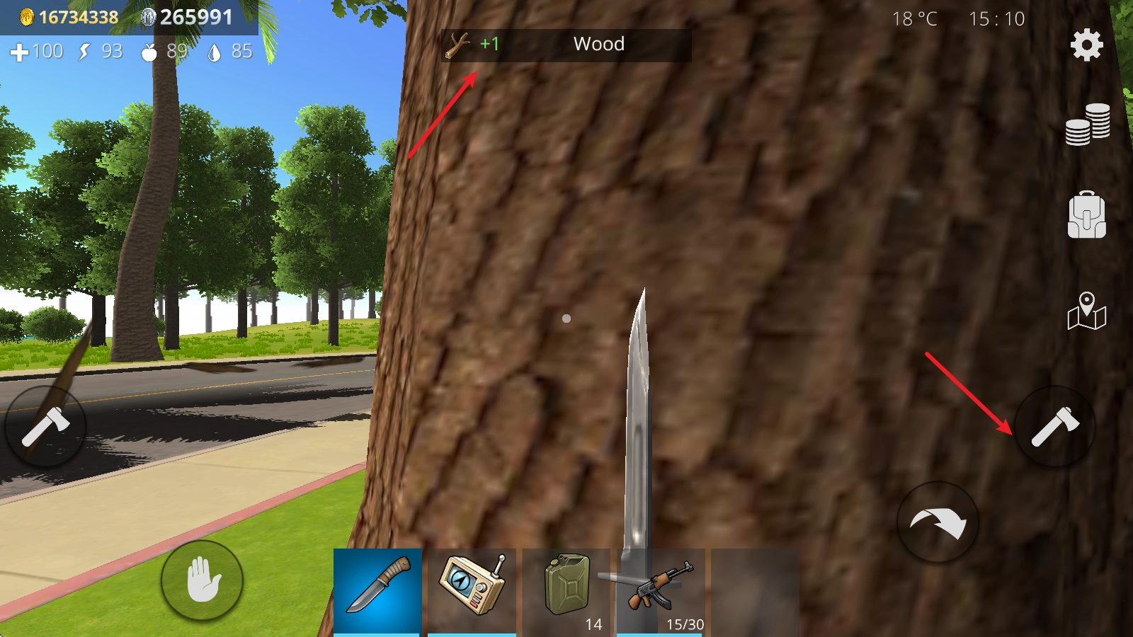 靠近物品后,可借助工具采集资源,比如对着树就能获取树枝。
