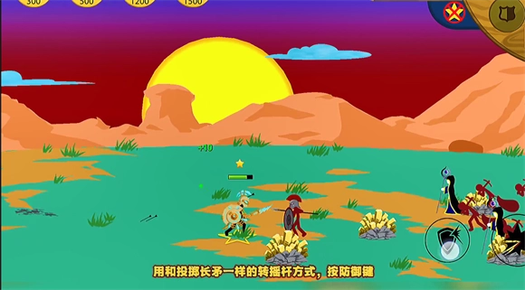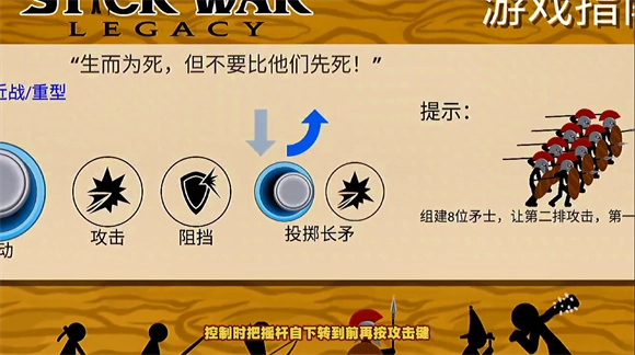 前期的战斗策略是:开局优先造一把矛,接着生产8个矿工;等敌人出现后,操控矛兵迎敌,同时让矿工后撤,依靠城堡里的弓兵进行射击输出;你自身则要举盾吸引敌方火力,确保雕像不会被敌人攻击。