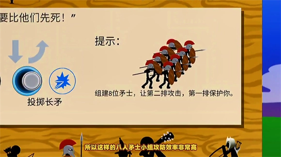 矛兵的玩法是这样的:前期先出剑士,之后采用我之前提到的对付巨人的战术就行,需要注意的是要多生产一些弓箭单位。