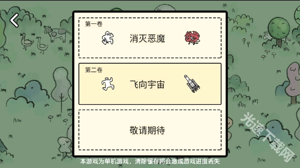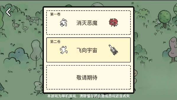 点击开始游戏后,你可以选择两个剧情来体验,第一卷“消灭恶魔”和第二卷“飞向宇宙”的游戏难度是一样的,只是剧情任务有所不同。