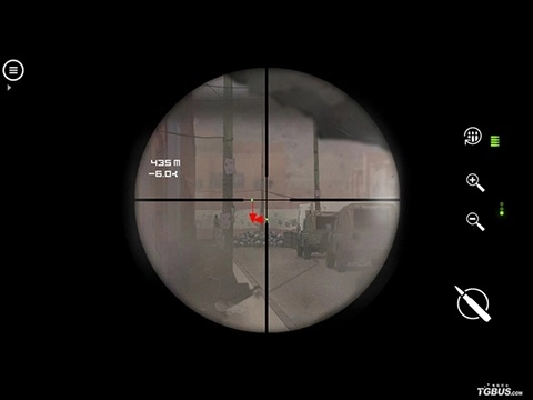 任务玩法:此关的风力更大,玩家应该在两个绿色的瞄准点交叉的位置上举枪射击才可。下图中两个红色箭头的交汇处就是当前狙击镜下所能射击到的方位。利用这个特性,击杀掉走路的上尉即可。