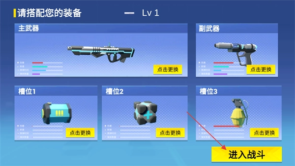 在开启游戏对局前,需要先完成装备的搭配。点击装备上的更换按钮,就能替换为更强大的武器并完成装备;之后点击进入战斗按钮,即可正式开始对局。