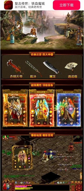 复古传世铁血魔城正版游戏,这款完美还原端游传奇经典传世玩法的手机小游戏,将为玩家小伙伴们带来一场全新升级武器系统玩法的经典传世攻沙传奇对战游戏世界体验,期待你的绝佳表现哦!