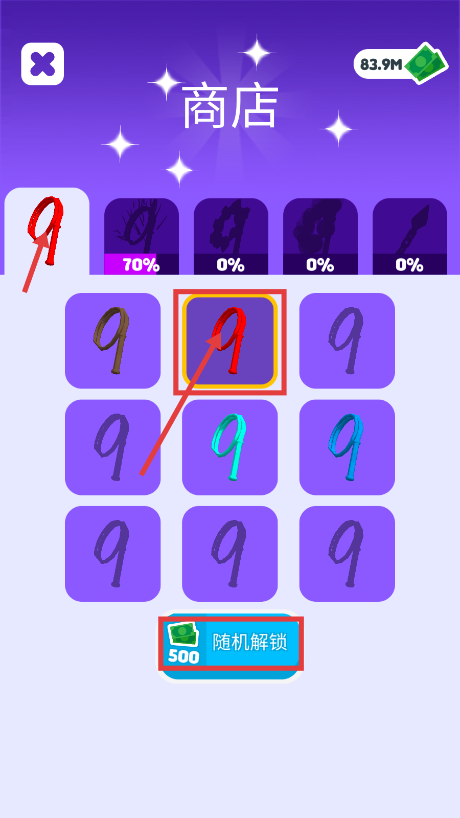 1、在【商店】界面消耗资源并点击【随机解锁】,即可获取样式各异的鞭子道具,通过丰富道具类型来更好地应对不同关卡场景。