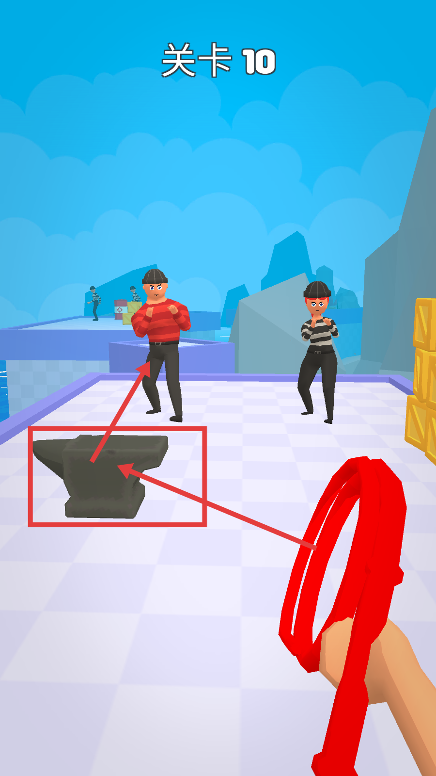 2、挑战【关卡10】时,应优先留意场景里的【油桶-危险物品】,借助鞭子优先对其进行处理,防止被罪犯利用而形成阻碍。