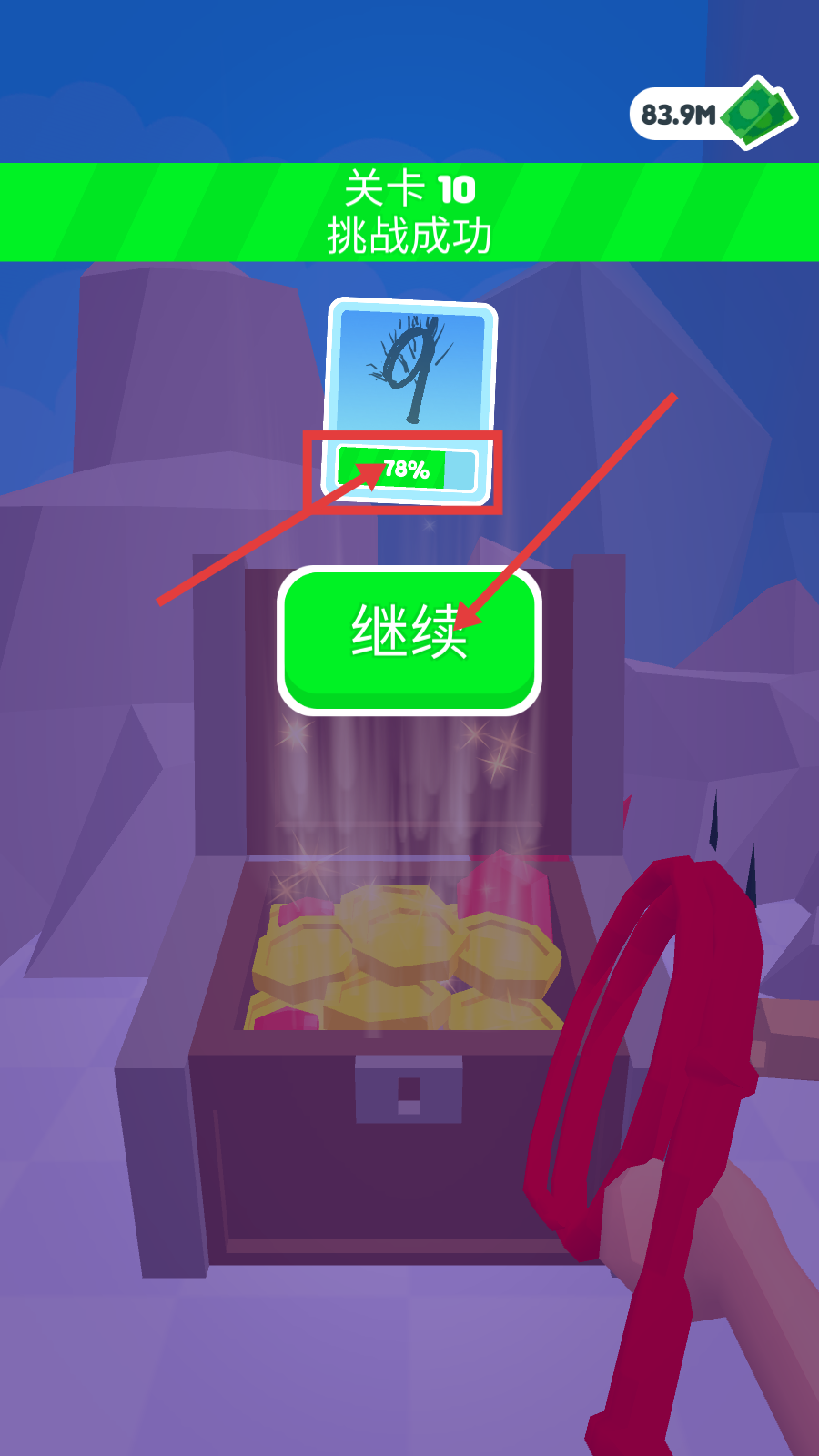 4、【关卡10】挑战完成后,可查看鞭子的解锁进度【78%】,点击【继续】按钮开启下一段挑战,通过逐步积累进度来解锁更多道具。