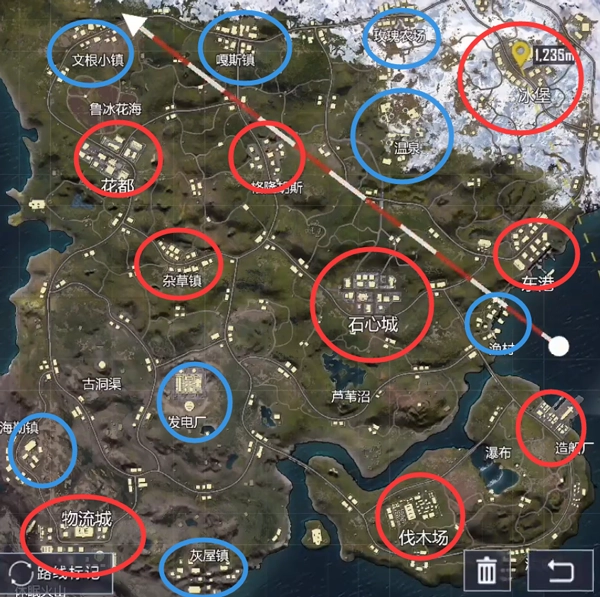 根据体验服当前的物资丰富度和敌人跳伞分布情况,大致能把物资点分成两类:一类是高物资点,对应图中的红圈标记;另一类是物资刷新中等的区域,也就是图里的蓝圈位置。