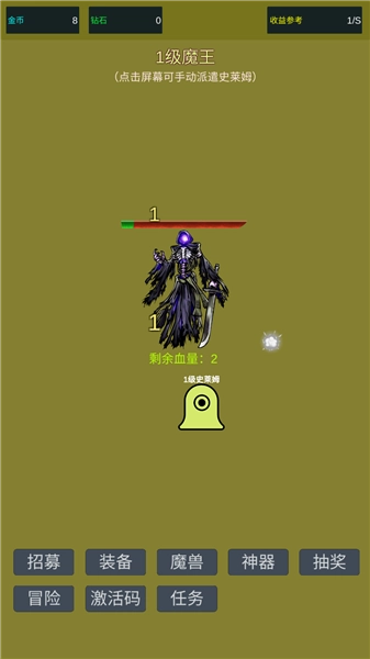 2、史莱姆会自动攻击魔王,也可手动点击屏幕派遣。
