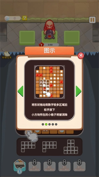 2、将形状放置在数字数量较多的格子上,随后松开手,小方块所在的位置便会被消除。
