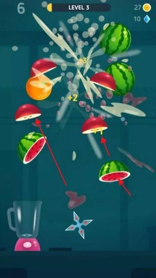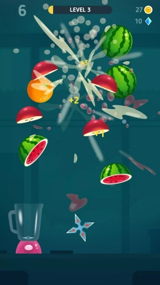 1、核心玩法是切割水果,要在水果掉落之前精准滑动屏幕将它们切开,不能错过任何水果,不然可能会对得分或者闯关进度造成影响。