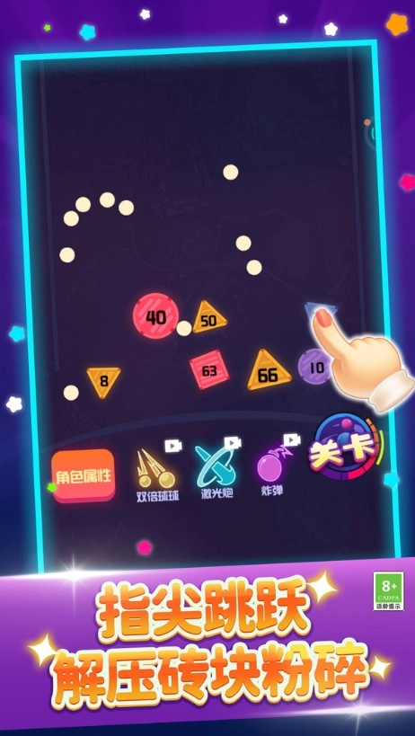极致解压反馈:小球碰撞的震动特效与方块碎裂动画,带来酣畅淋漓的视效音效体验。 策略深度融合:弹射角度、反弹路线预判及技能释放时机,多重决策增强关卡挑战性。