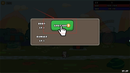 3、点击绿色的UPGRADE按钮来提升身体与伤害等级,强化之后生命值上限会从100增加到200,魔法值也会同步提升到30点。