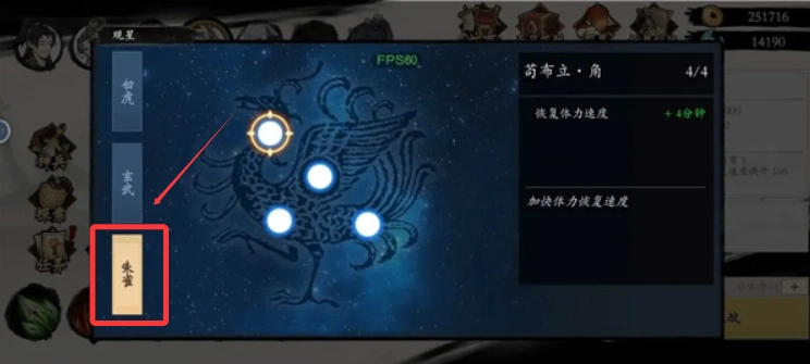2、接着去点击观星功能,它位于界面的右上角位置。在观星点数尚未点满的情况下,是可以进行重置操作的。如果喜欢刷图的话,建议先把朱雀系里的体力恢复加速这个点数点出来,至于旁边的挂机时长相关点数,可以之后再考虑点击。