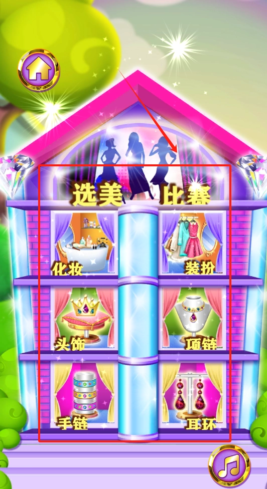 2、进入粉色房子的选美界面,挑选化妆、装扮和首饰,打造出完美造型去参赛吧。