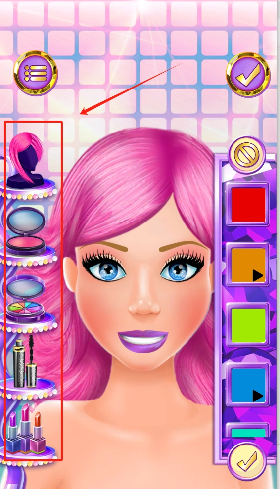 3、使用左侧的美妆工具为女孩化妆,点击右侧的色块来挑选颜色,打造出富有个性的妆容吧。