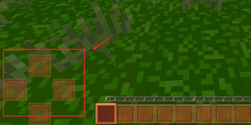 3、用物品栏选中四个方块,顺着箭头所指的方向去探寻一番,找到那隐藏起来的宝藏吧。