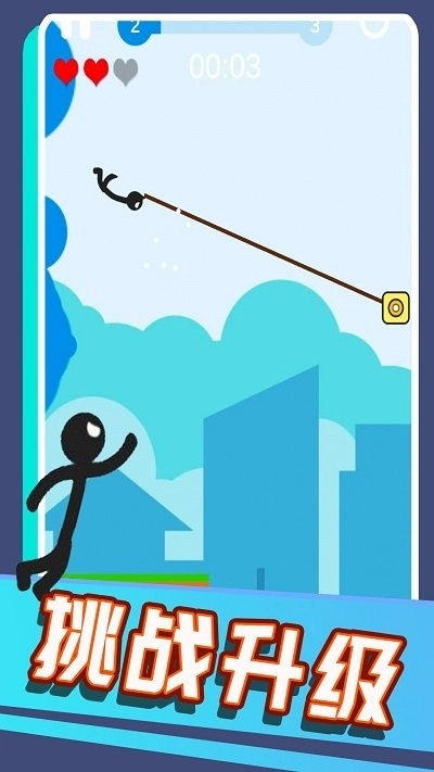 玩家在游戏里用手指点击屏幕来操控火柴人的绳索,开启一段趣味十足的跳跃闯关冒险。