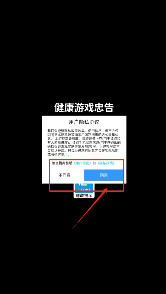 1、点击“同意”即可进入游戏,若选择“不同意”则会退出,请留意查看隐私协议与适龄提示。