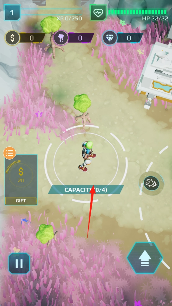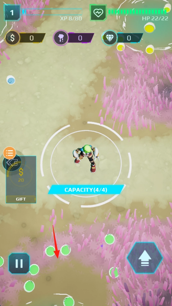 2、留意“CAPACITY(0/4)”(红箭头所指处),靠近绿色史莱姆,系统会自动收集,待容量填满至(4/4),即可完成资源积累。