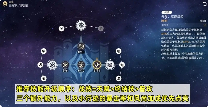 2、技能升级方面,建议优先提升【战技与天赋】(二者优先级相当),之后再考虑终结技和普攻;额外能力以及小行迹中的暴击率、风尚加成这几项,建议优先点亮。