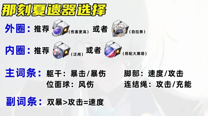 2、主词条搭配建议:躯干位置优先选择暴击或暴伤属性,脚部位置可根据需求选择速度或攻击属性,位面球需固定选择风伤属性,连结绳则建议选择攻击或充能属性(以确保技能循环流畅)。