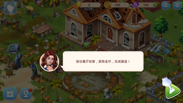 1、呈现需要修缮的破旧房屋,给出提示【前往餐厅经营以获取金币,完成建造】,界面包含资源数量、角色头像及操作指引;核心玩法围绕餐厅经营赚取金币来修复建筑,属于经营养成类游戏。