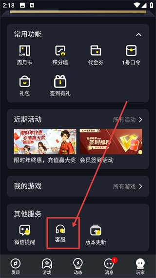 2、进入玩家页面后找到【客服】选项并点击,即可进入客服中心页面,咨询游戏相关问题。