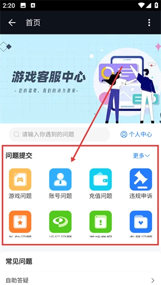 3、在客服中心页面的【问题提交】区域,可选择【游戏问题】【账号问题】等类别,提交相应的咨询内容。