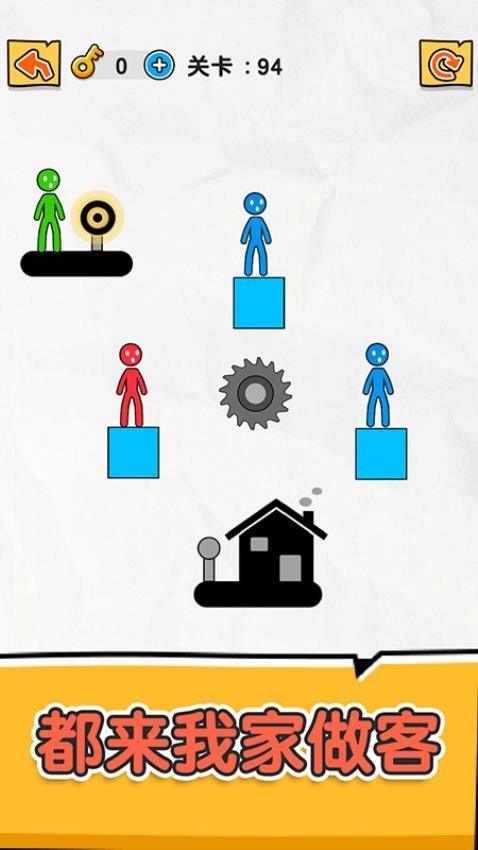 2、在关卡中需要灵活走位与移动,不断突破自身极限,将火柴人牵引至指定位置。