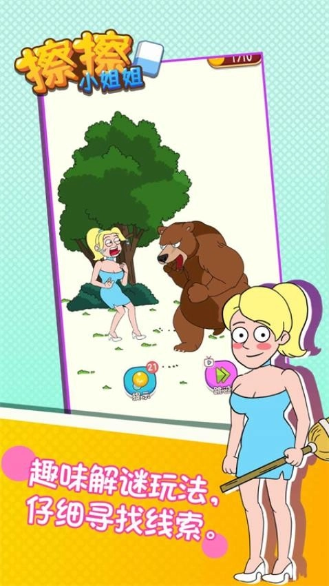 《擦擦小姐姐》是一款超有趣的休闲益智游戏,游戏采用诙谐搞笑的卡通画风,搭配写实场景与鲜明活泼的人物形象。玩家需要仔细观察画面,寻找隐藏线索推进解谜——用手中的橡皮擦,擦去那些看起来“不对劲”的地方,自由开启挑战。 游戏丰富关卡,难度会随进度逐步升级。你的目标是帮小姐姐扫除霉运、守护美好的一天:开动脑筋、睁大眼睛,仔细探索场景角落,不仅能找到藏起来的宝箱,还有多个隐藏物品等待挖掘。动动手指解锁任务,越玩越烧脑刺激!感兴趣的话千万别错过,随时都能打开游戏尽情畅玩~