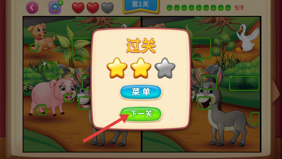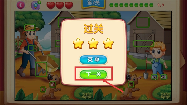 4、找出9处不同之处后,点击【下一关】按钮,即可开启新的关卡挑战。