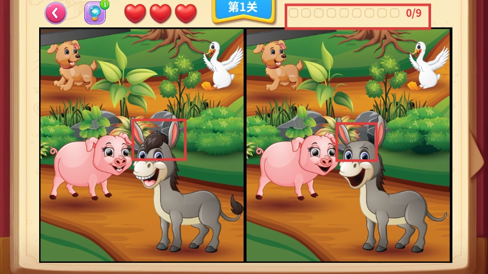 2、仔细对比左右两幅图,找出像驴子毛发、猪的特征这类不同之处并进行点击。