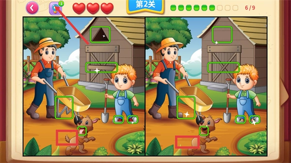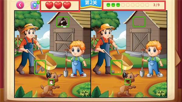 3、留意【谷仓】门的线条、【男孩】鞋子的颜色以及【狗】尾巴的位置这几处差异,可参照灯泡的提示进行观察。