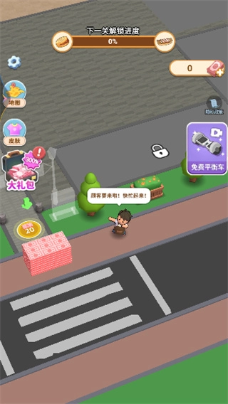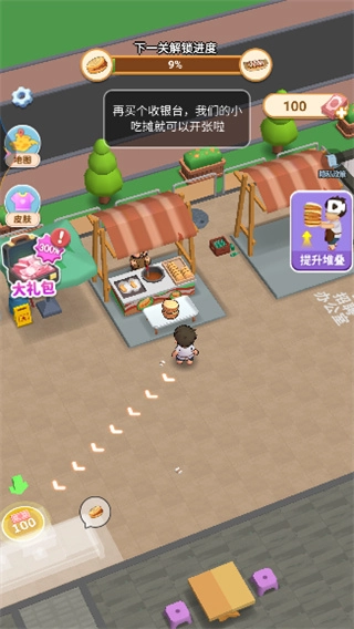 2、先根据引导解锁肉夹馍摊位,接着把收银台摆放好,这样你的小吃摊就能正式开始营业了。